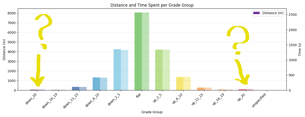 To solve this mystery, the second plot came into the play. It showed the elevation and the grade over the distance simultaneously, and actually helped to reveal the reason of having these crazy uphill and downhill sections in the first plot.