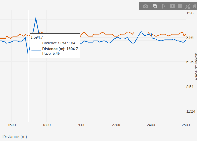 Stride length is calculated from speed and cadence readouts. As it can be seen in the screenshots, cadence seems pretty fine, but the speed is too high. Zoom-in in the next screenshot reveals that the spike follows quite a deep drop: