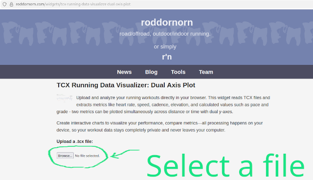 1. As the first step, upload a .tcx file with your running data. It can be exported from Garmin Connect, Strava, or other platforms.