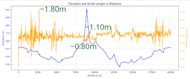 So, the conclusion - stride length may vary a lot in flat parts of route, but in very steep slopes it might be a good idea to decrease stride length a bit and maintain the desired speed by adjusting cadence.