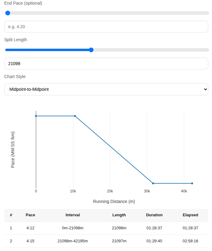 Adjust finish time or average pace with sliders or text inputs. The remaining values will be recalculated instantly, and the pace values for every split a going to be updated in the table and plotted in the graph, which provides a really nice visualization. This way, the calculator will make planning a pacing strategy much easier.